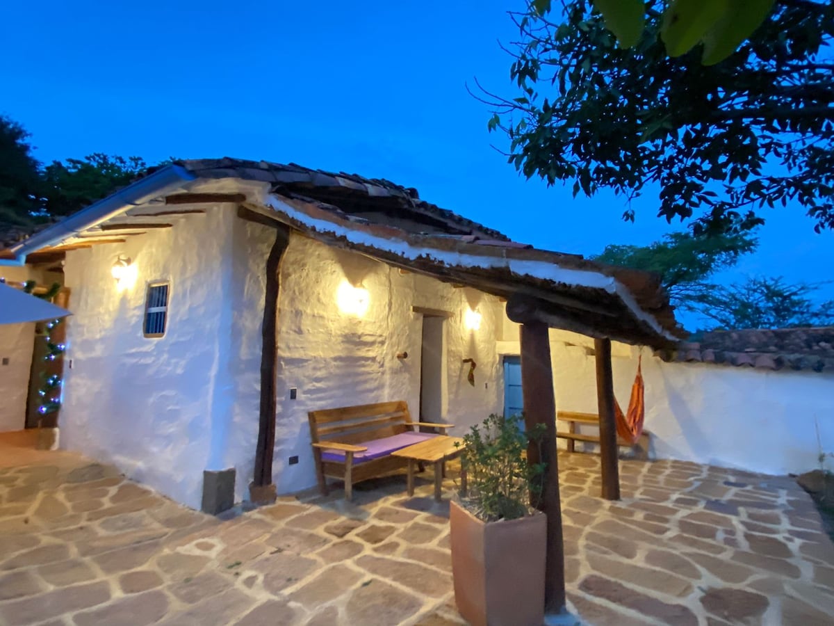 Te invitamos a pasar unos días de descanso rodeado de naturaleza en El Tamarindo! Esta cabaña rústica fabricada en tapia pisada se encuentra dentro de una reserva natural, a cinco minutos en carro del casco urbano de Barichara o a veinte caminando. Cuenta con UNA habitación con una cama Queen, un sofacama y UN baño con ducha al aire libre, cocina totalmente equipada (con nevera y estufa de gas) y una sala comedor con hamacas.