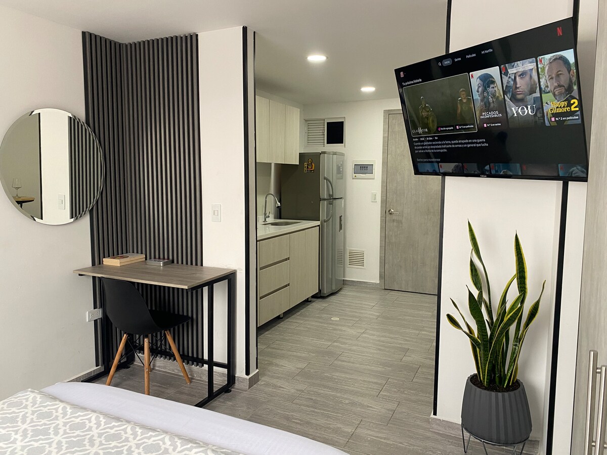 Relájate en este tranquilo y elegante apartaestudio renovado completamente por su suscrito anfitrión Super host de Airbnb. En la mejor ubicación de la ciudad, cerca a los mejores restaurantes y bares de la ciudad. En sus 39 mts2 puedes contar con moderna cocina Dotada con todo lo necesario para tu estancia, cómoda sala con amplio sofa , barra de desayuno, escritorio y silla, amplia habitación con cama matrimonial, smartv 40", ventilador, balcon y baño privado con agua caliente.