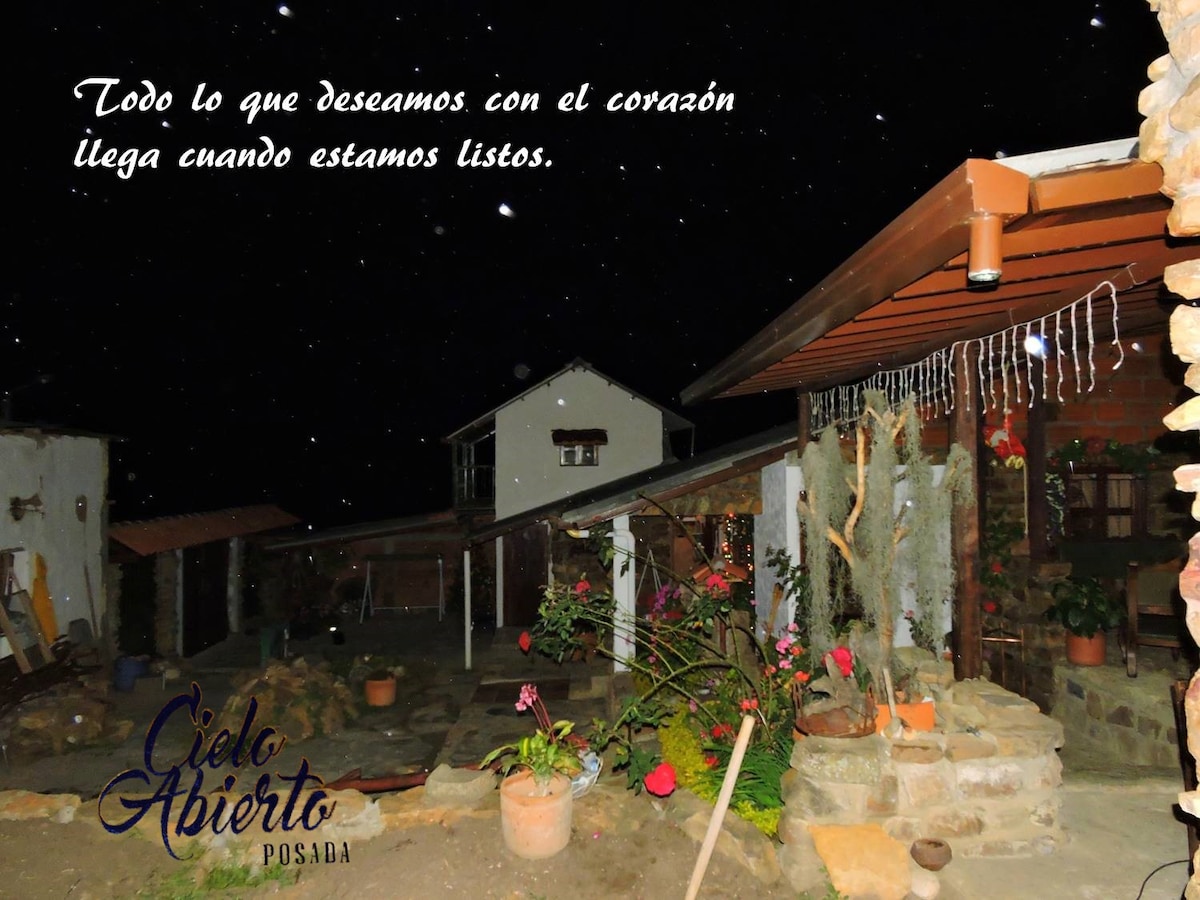 Valor del hospedaje por persona incluye: * Desayuno. * Precios de apertura. Pregunta si quieres adicionar a tu plan servicio de almuerzo y cena. En nuestros anuncios también ofrecemos planes para viajeros solos, en pareja o grupos. Cielo Abierto posada es un lugar de contemplación y relajación, en un clima primaveral rodeado de azul y verde. El mejor ambiente familiar, donde ponemos nuestra atención en su estadía y descanso. RNT-103005