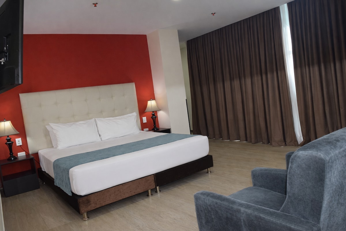 Moderna Habitación de Hotel de 1 Dormitorio y un Baño disponible para alquilar. Situado en la Avenida de las Américas. La Habitación incluye desayuno , Televisor Pantalla Plana Con Netflix, Internet de alta Velocidad, Parqueadero junto al edificio.