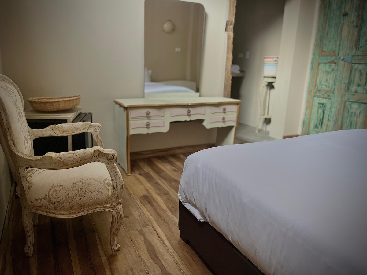 Disfruta de una estancia cómoda y elegante en esta espaciosa habitación con cama doble, baño privado y cerradura electrónica para mayor seguridad. Relájate con aire acondicionado, iluminación cálida y una decoración de lujo. Incluye sábanas de alta calidad, edredón y toallas premium. Ubicada en la avenida principal de Los Patios, con acceso a zonas comunes al aire libre para una experiencia inolvidable.