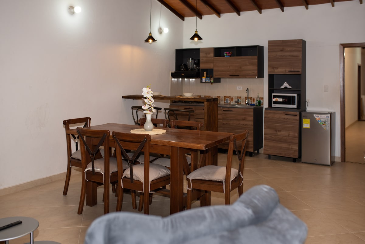 Encontraras un espacio moderno, tranquilo (zona familiar, sin ruido por encima de la 21 horas) y cercano al centro del pueblo con parqueadero interno. Área en construcción, via de acceso al apartamento sin pavimentar pero en buenas condiciones. Cuenta con un solo parqueadero, es estrecho y alcanza un carro convencional que toca parquear en reversa. Hay zona de parqueo para motos (adicional). Diseñado para acoger desde 1 a 8 personas confortablemente. Servicio se 🛜, Netflix y YouTube premium.