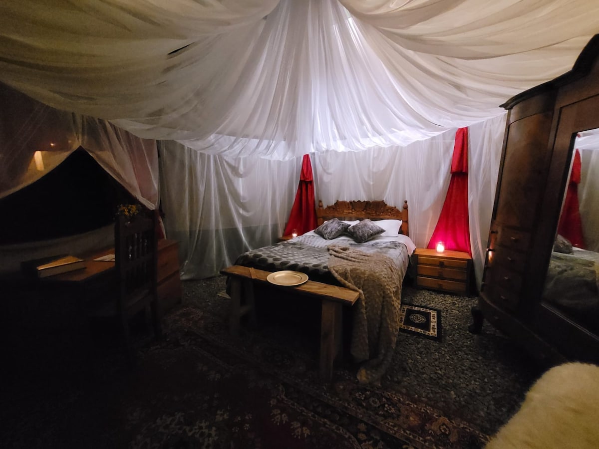 La Carpa Medieval Aragorn es una tienda de 5 m de diámetro, inspirada en antiguos refugios de guerreros, ideal para desconectarse y vivir una experiencia única en la naturaleza. Cuenta con cama doble de madera tallada, armario y escritorio; se puede añadir cama auxiliar para hasta 3 personas. Dispone de baño seco compartido, ducha con agua caliente (se calienta a través de tubos de cobre, luz solar. Rodeada de paisajes mágicos, a 10 min de Monguí.