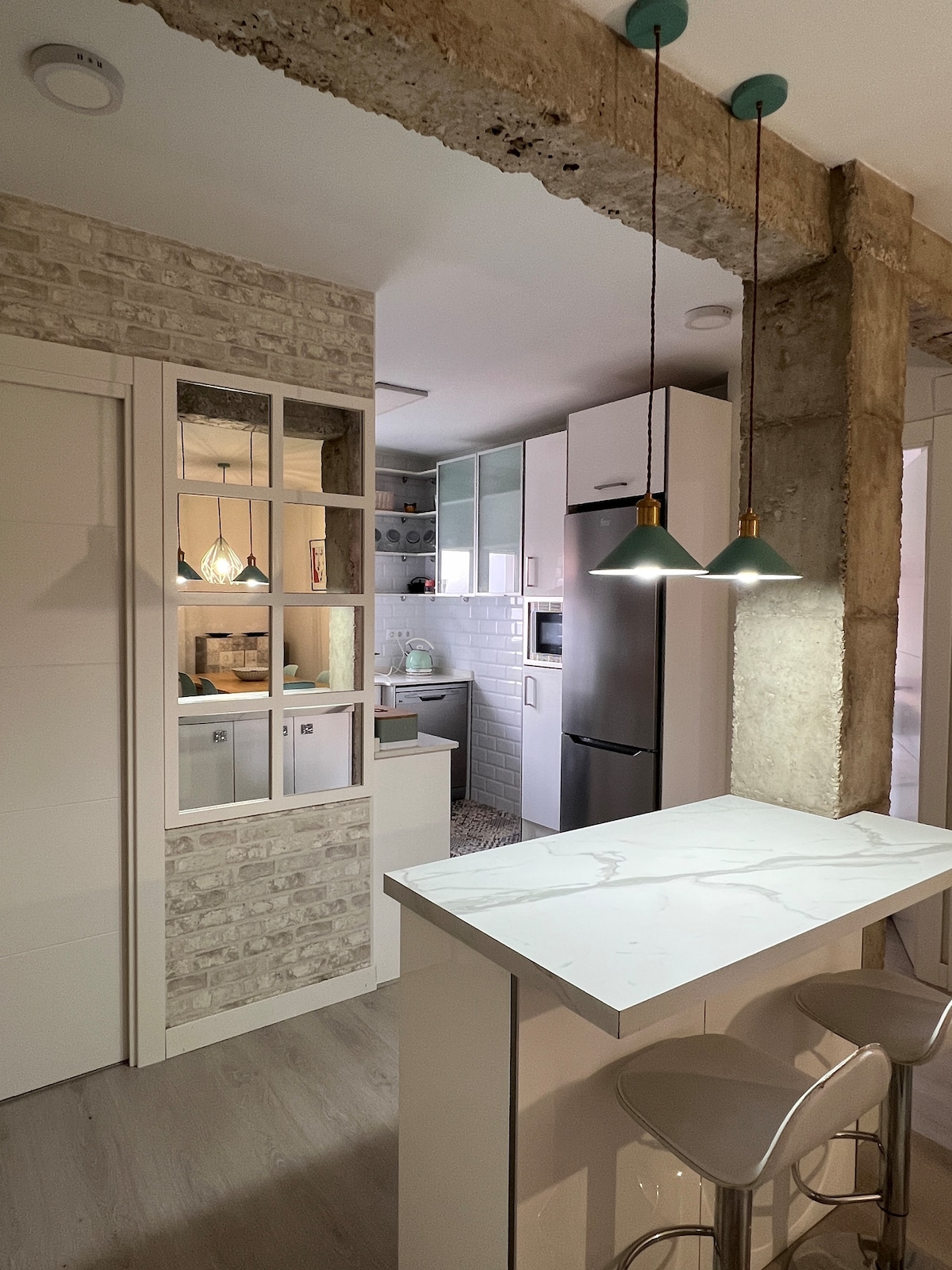 Estética Vintage. Entrada independiente.Grandes ventanales, balcón. Habitación con cama de matrimonio de 150x190, Smart TV. nueva.Cocina completamente equipada (frigorífico, horno, microondas, tostadora, cafetera italiana, hervidor de agua, ventilador, calefactor ,utensilios de cocina..) Salón-comedor con televisión de 42". Mesa-estudio , libros. Baño equipado, incluye secador de pelo. Autovía (S20) a 200 metros. Zona tranquila, fácil aparcamiento. Playas a 5 minutos, rutas costeras ....