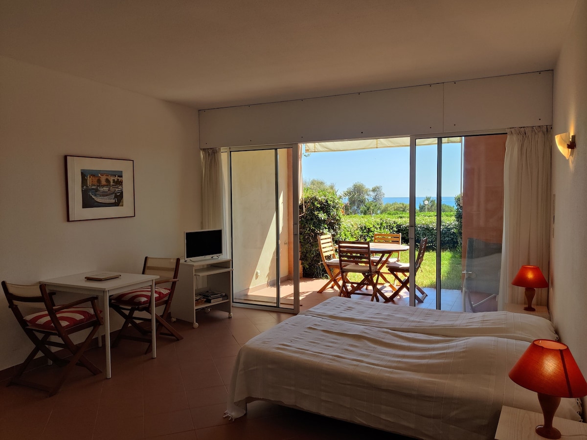 Une vue mer exceptionnelle pour ce lumineux T2 climatisé. Une résidence de standing sécurisée (portail électrique à code). De quoi passer des moments magiques dans cet appartement confortable et baigné de lumière. Une grande piscine et deux terrains de tennis participeront à votre détente. Par ailleurs, à 400 mètres de l'appartement une plage presque privée s’offre à vous (inconnue du grand public).Idéal pour un ou deux couples, les voyageurs en solo ou une famille.