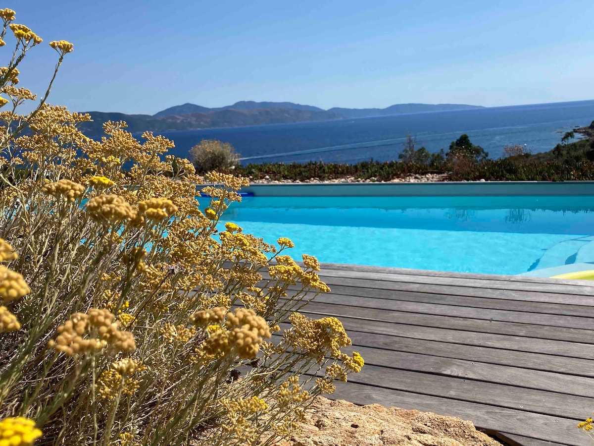 Charme et Sérénité dans un panorama exceptionnel Vous découvrirez à partir d’une terrasse en ipé de 80m2, une vue panoramique sur la mer et le maquis. Vous prendrez vos petits déjeuners et vos repas et profiterez de votre piscine des merveilleux couchers de soleil sur la mer Corse et prendrez l’apéritif dans un salon dominant la vallée toujours face à la mer. Vous pourrez découvrir les espèces endémiques du maquis et profiter d’endroits ombragés inspirant quiétude et repos.