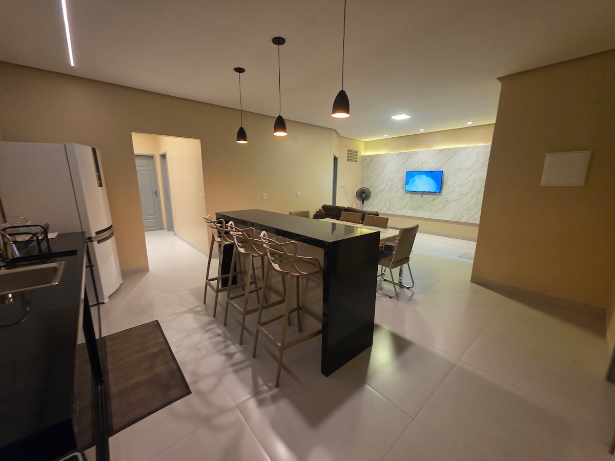 Espaço inteiro, ideal pra quem busca comodidade, a poucos passos do rio Tapajós. Localizado em área comercial, em frente ao Mercadão 2000, acesso fácil à todas as linhas de ônibus, farmácias, caixas eletrônicos, lotérica, restaurantes e supermercado. Quarto para até 02 pessoas com central de ar Internet Wifi 390 Mbps Cozinha equipada Área externa privativa ventilada Sala com ventilador portátil, livros e toca-discos e discos raros