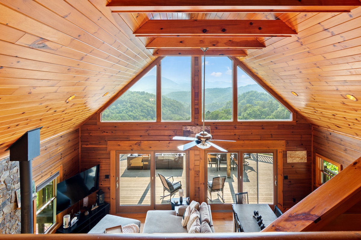 5卧室原木小屋•热水浴缸、游戏室、院子、火坑!