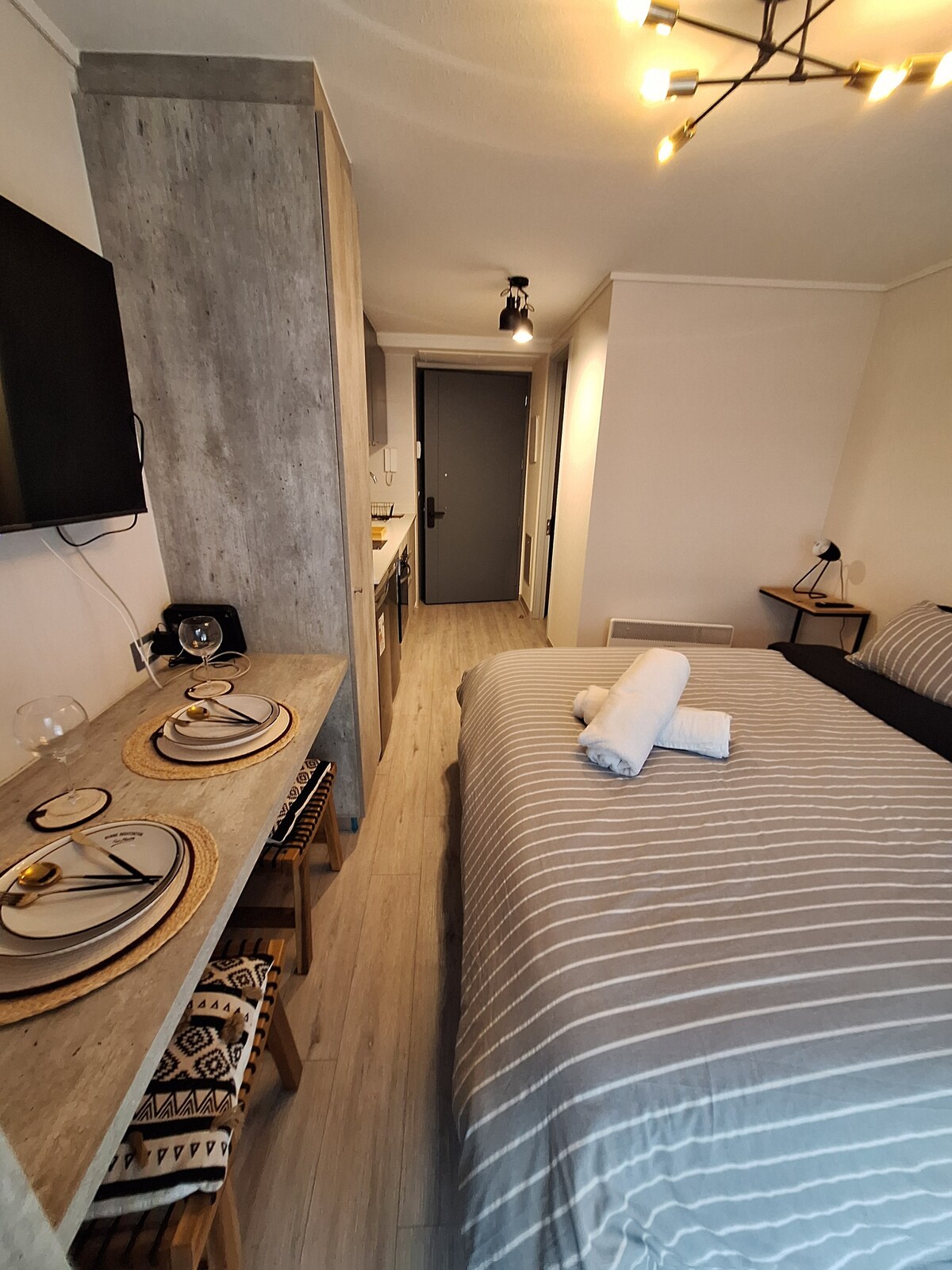 Bienvenido a nuestro espacio moderno completamente equipado en el corazón de la ciudad. Cercano al metro, podrás caminar a los lugares turísticos de la ciudad. Elegantemente decorado y todas las comodidades en un solo lugar. Transporte publico a la puerta, supermercado, farmacias, tiendas, bares y restaurantes a una cuadra del departamento. Piscina disponible en temporada, aire acondicionado y estacionamiento. Espacio habilitado para 4 personas.