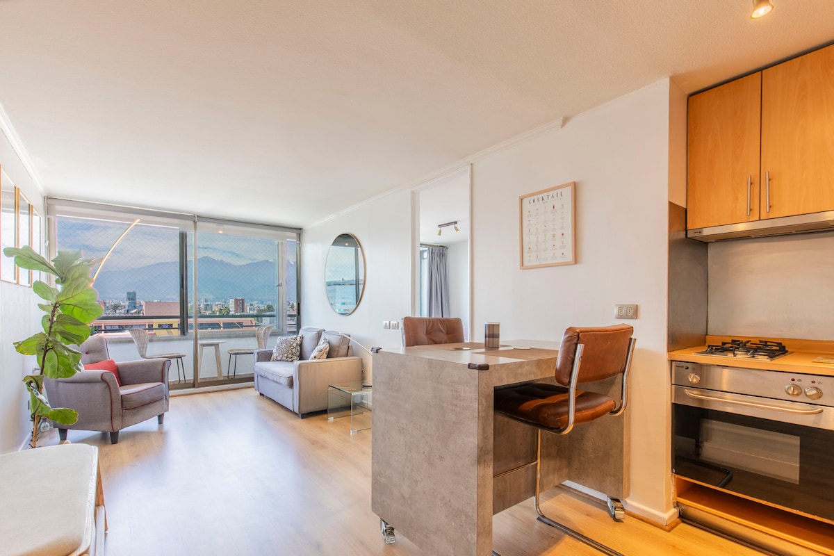 Encantador departamento en el corazón de Santiago con una impresionante vista panorámica del centro de la ciudad. Disfruta de los rascacielos iluminados por la noche y de paisajes urbanos durante el día. Este acogedor espacio cuenta con comodidades modernas, una decoración elegante y todas las comodidades necesarias para una estancia inolvidable. Desde el balcón privado, podrás deleitarte con vistas panorámicas que abarcan desde la cordillera hasta los puntos emblemáticos de la ciudad.