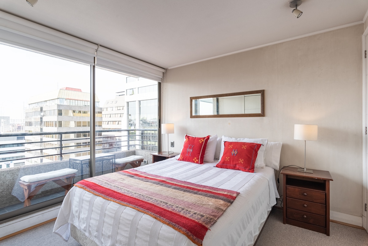 Luminoso departamento con hermosa vista, ubicado en el corazón de Santiago. A pasos de la estación Salvador de la línea 1 del metro y del centro de Santiago. A tres estaciones de metro de la zona comercial de Providencia (Estación Los Leones), a cuatro estaciones del mall Costanera Center (estación Tobalaba) y a 20 minutos del aeropuerto internacional (por autopista). Completamente equipado, con estacionamiento al interior del edificio. Ideal para recorrer o hacer trámites en Santiago.