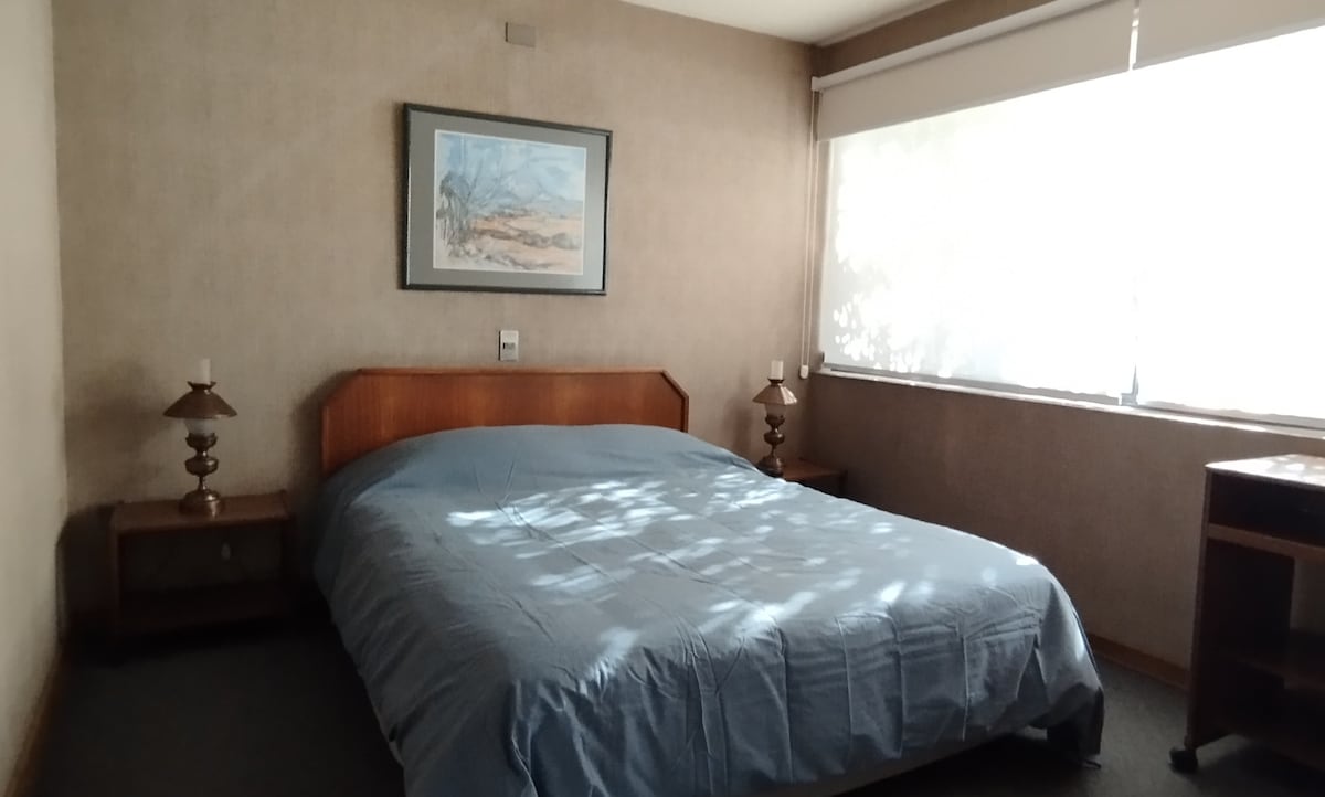 Amplia habitación matrimonial con baño privado. La habitación queda en el Hotel Nogales, Ubicado en providencia cerca del metro los Leones, costanera center y en un barrio tranquilo y residencial. Se puede agregar desayuno estilo buffet por 12.000 pesos.
