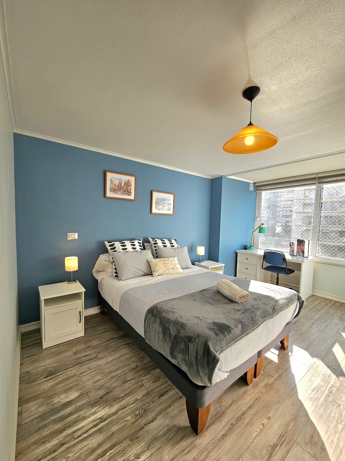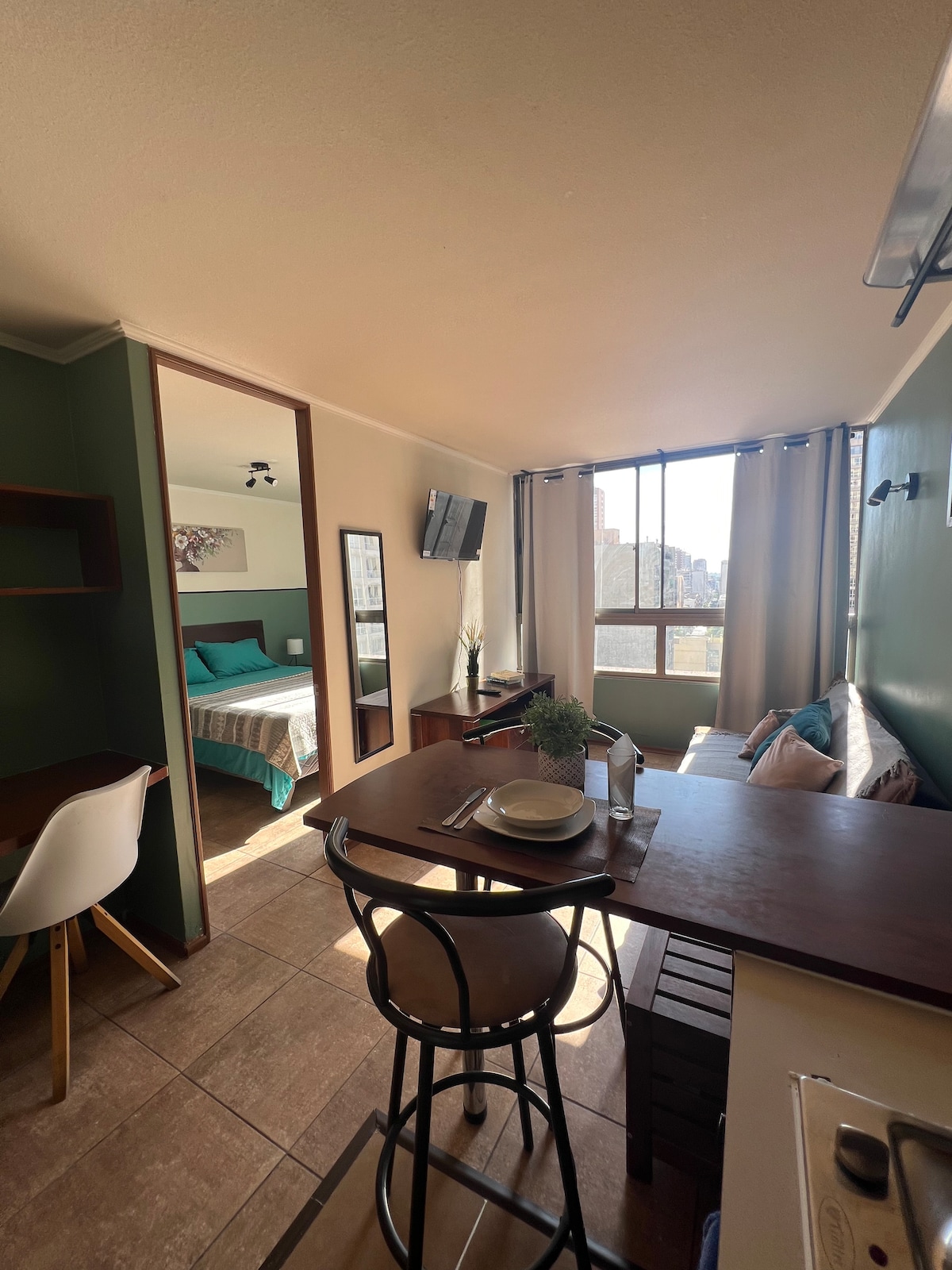Moderno y acogedor departamento con aire acondicionado en el corazón de Santiago. A pasos del metro y del Centro Histórico, rodeado de museos, mercados y restaurantes. Cama king, cocina equipada, balcón y wifi rápido, ideal para viajes o estadías largas. Edificio seguro con conserje 24/7. Atención personalizada, check-in flexible y recomendaciones locales para que disfrutes la ciudad como un residente, con comodidad y tranquilidad.