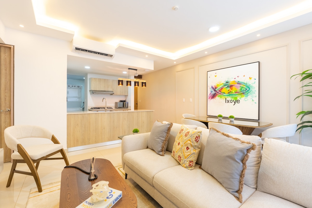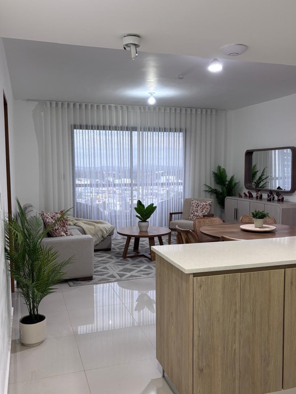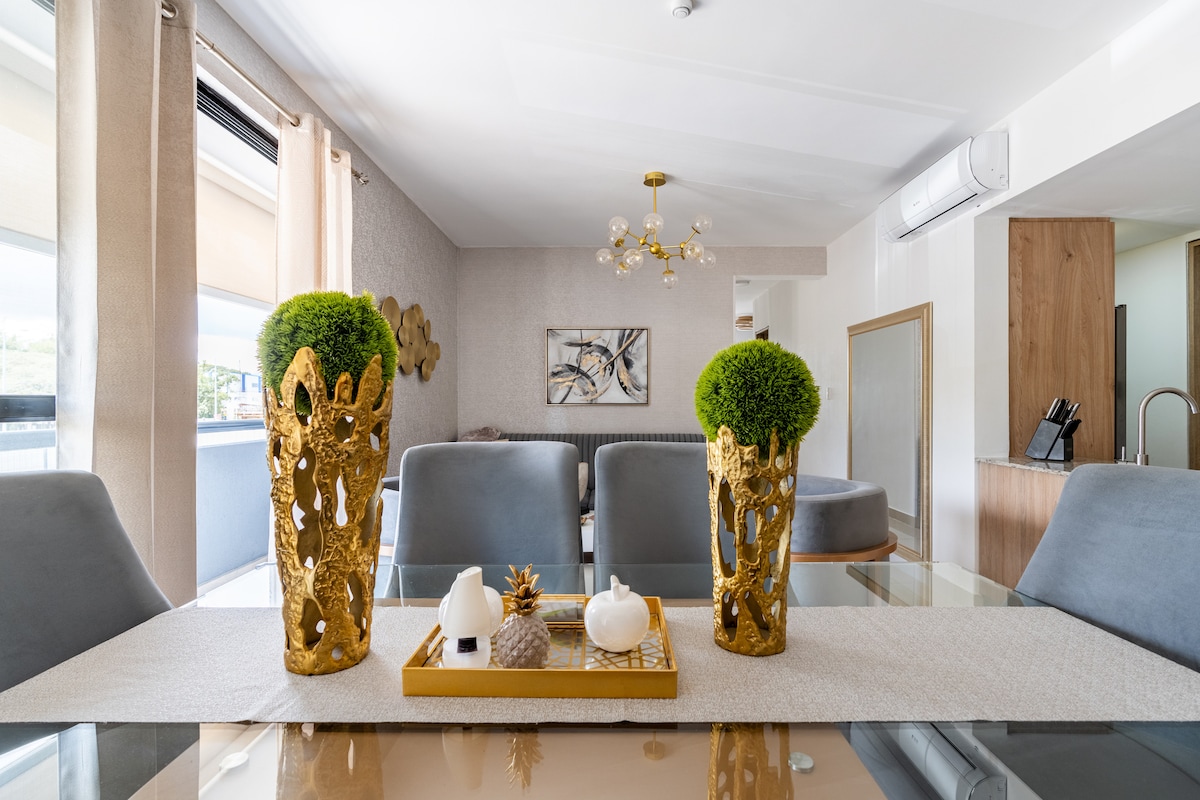 Luxury modern apartment with pool and mountain views, minutes from Cibao Airport. Features king & queen beds, fast Wi-Fi, smart TV, full kitchen and free gated parking. Perfect for families, couples and business travelers seeking comfort and style. ✔ Spacious living room with stylish décor ✔ King bed + Queen bed with premium mattresses ✔ Fully equipped kitchen ✔ Fast Wi-Fi and Smart TV ✔ Free gated parking ✔ Pool access — one of the few in the area