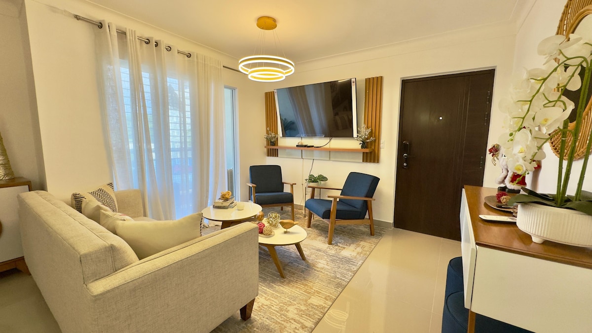 ¡Relájate con toda la familia en este Hermoso Apartamento en el 1er Piso! Incluye: *3 Habitaciones con sus Aires Acondicionados *Sala con Juego de Mueble L y Smart Tv * 2 Televisores * Cocina Equipada con Nevera, Estufa y todos los utensilios para Cocinar * Juego de Comedor para 6 Personas * Área de Lavado con su Lavadora *Terraza con Comedor, Mesa de Dominó y BBQ * Parqueo para 2 Vehículos *Internet, Wifi y Tv con Cable. El Apartamento se encuentra a solo 3 minutos del Aeropuerto Cibao.