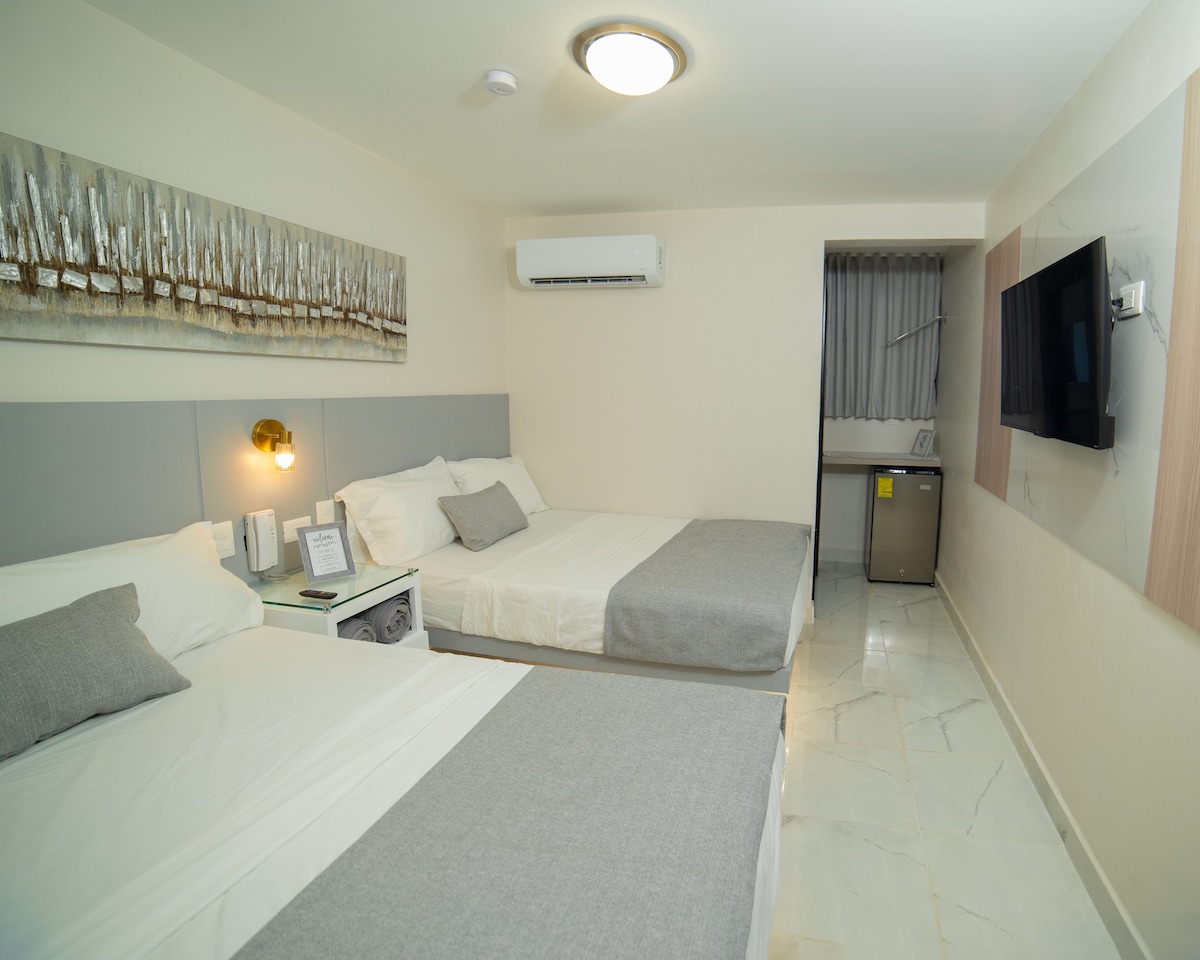 A 30 square meter room, featuring two queen beds, an optional crib, free parking, free breakfast, a private bathroom and shower, a refrigerator, desk, mini-bar, room service, daily newspaper, and much more. Ideal for family or friends wanting to see Santiago and the Dominican Republic, and stay close to each other while on the property.