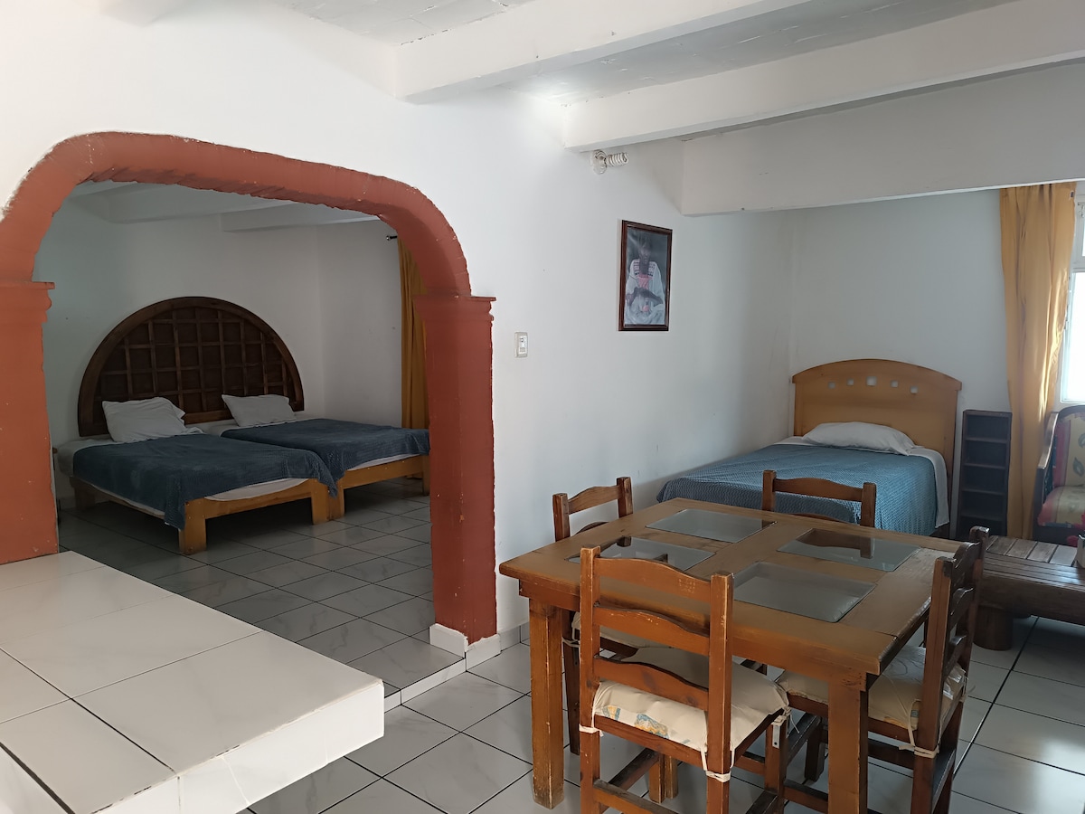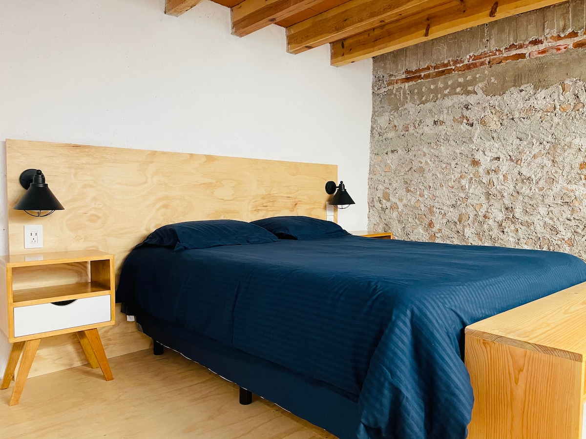 Loft moderno y completamente equipado en el corazón del Centro Histórico de Querétaro. Ideal para parejas, viajeros de trabajo o estancias medias. Cuenta con: • Tapanco con cama QS • Sofá cama matrimonial • Aire acondicionado • Cocineta equipada • Baño completo privado • Comedor para 4 personas • TV y excelente ubicación A solo unos pasos de restaurantes, cafés, museos y todo lo mejor del centro. Perfecto para disfrutar la ciudad caminando o trabajar cómodamente durante tu estancia.