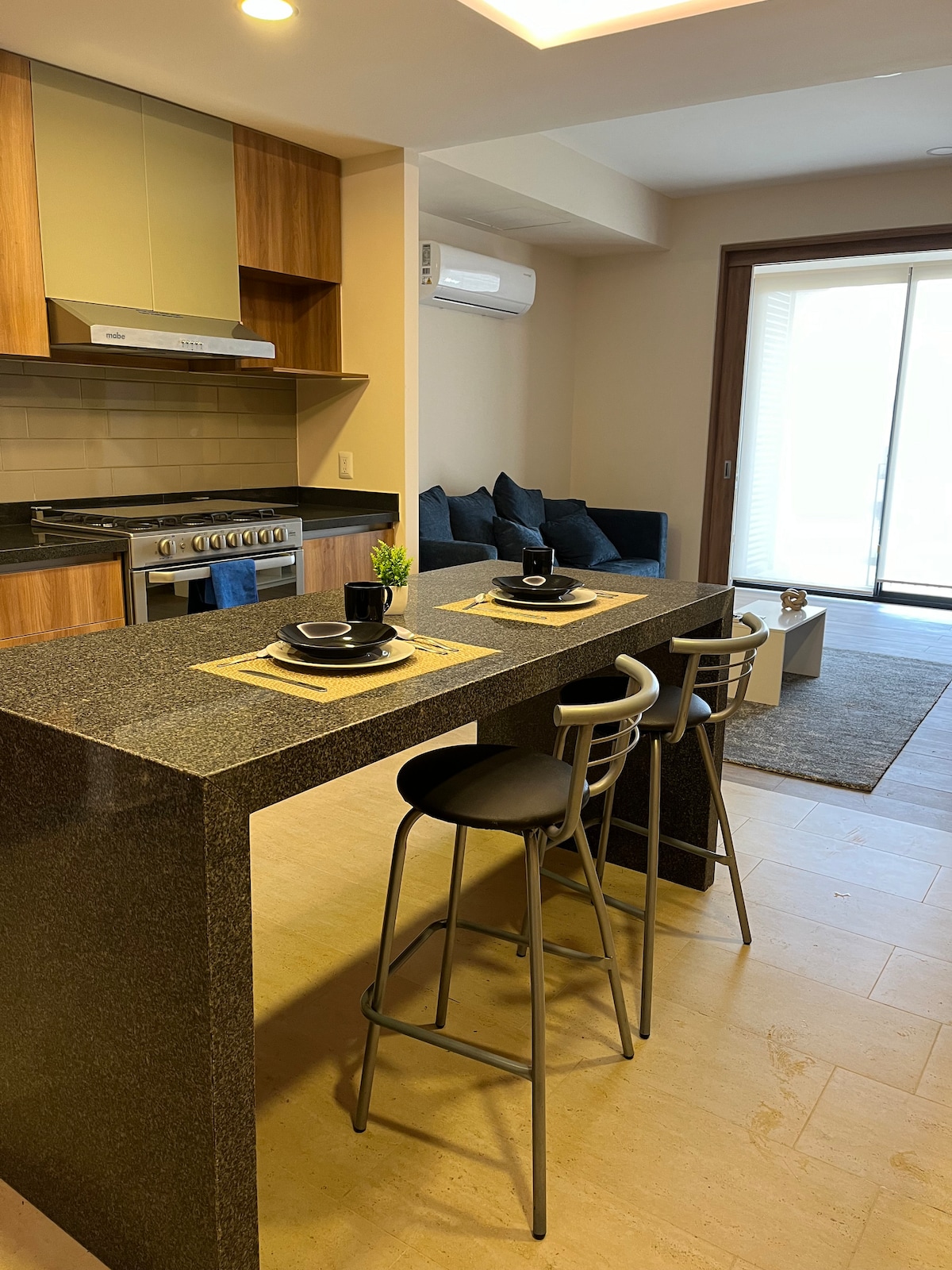 Hermoso Departamento con amplia terraza, limpio y muy acogedor. la construcción es nueva, así como los muebles que hay en su interior. el departamento es de concepto abierto, solo hay un biombo que separa el área del dormitorio con la sala, para dar un poco de privacidad. Hay un sofá cama, tamaño matrimonial, en la sala El departamento tiene amplias ventanas que brindan una excelente iluminación. y cuenta con una linda terraza, rodeada de plantas.