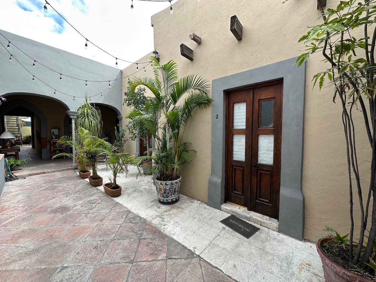 Departamento con excelente ubicación en el centro histórico de Querétaro a pocos mts de las principales plazas y jardines así como de la red de andadores. Excelente para visitar caminando museos, edificios emblemáticos del barroco como Iglesias, conventos, etc ... y la vida nocturna del centro de la ciudad. Hospédate en una casa antigua del siglo XVIII remodelada para departamentos con dos patios y arcadas interiores, terraza con vista a la ciudad y vigilancia las 24 hrs.