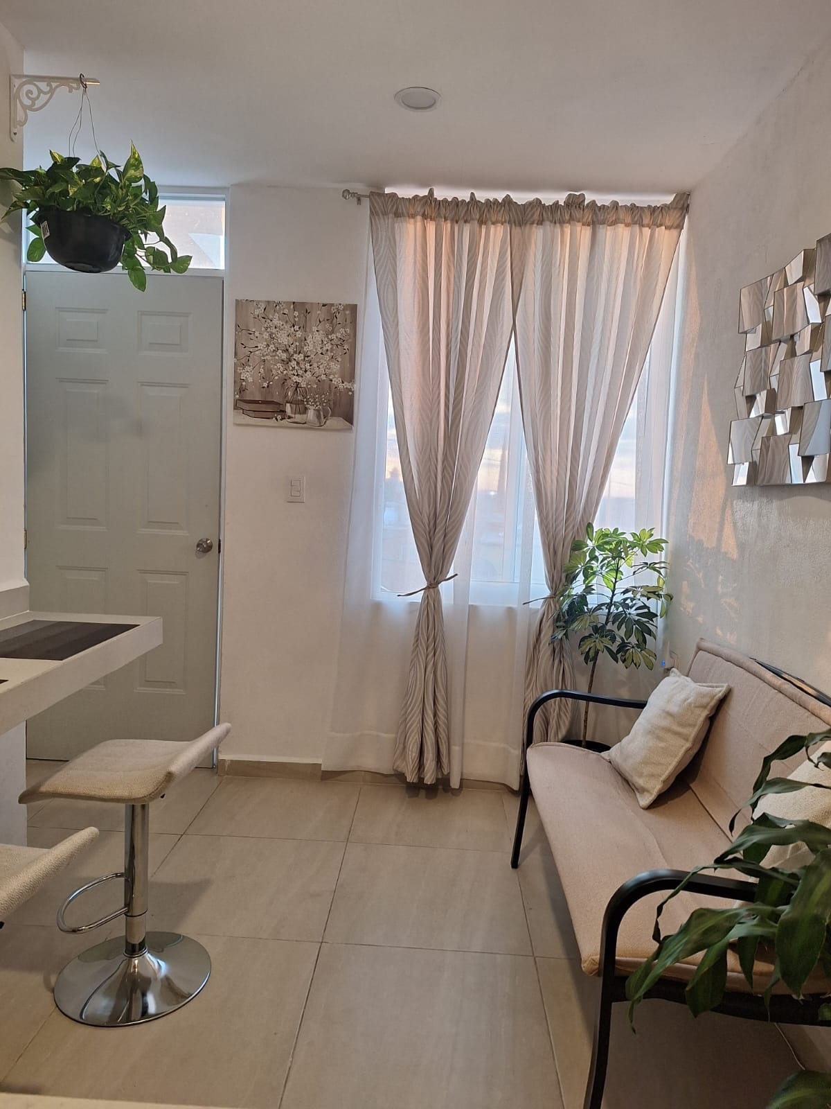 Beautiful suite Boutique concept furnished with antique touch but fully equipped. Heart of the historic center. Beautiful apartment located on pedestrian street in the best location in downtown w/ amazing private rooftop terrace. The apartment sleeps 2 people is fully equipped with private bathroom, kitchen and dining area. Walking distance to everywhere in downtown Queretaro. The place is clean quiet and full of design. Nice terrace Safe box Bathroom Queen size bed Dining room Living room 49