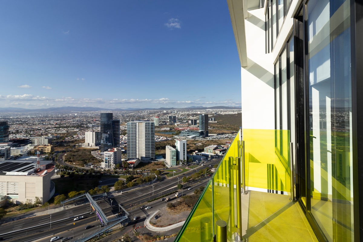 Departamento Elegante con Vista Panorámica de la Ciudad de Querétaro Completamente equipado para pasar una noche o un mes completo Ubicado en una de las mejores zonas de Querétaro, Milenio III El departamento cuenta con una amplia recámara, cama King Size, closet completo y una hermosa vista, igualmente cuenta con sofa cama, comedor, baño, cocina equipada para preparar tus cenas favoritas! + Internet en fibra óptica de 300Mb + Aire acondicionado + Estacionamiento