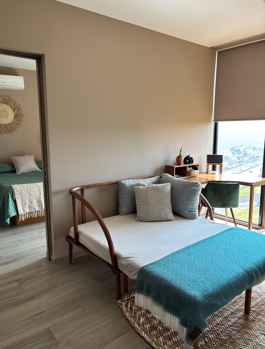 Tropic: Beach-Inspired Apartment in Querétaro Tropic is a cozy, beachy-style apartment perfect for remote workers, digital nomads, or tourists. Located in a prime area of Querétaro, it’s close to cafes, restaurants, stores, and a bus station. The apartment features a queen bed, sofa bed (accommodates up to 3), a dedicated workspace with stunning views, and a fully equipped kitchen. Enjoy the perfect balance of comfort, style, and convenience during your stay in Querétaro.
