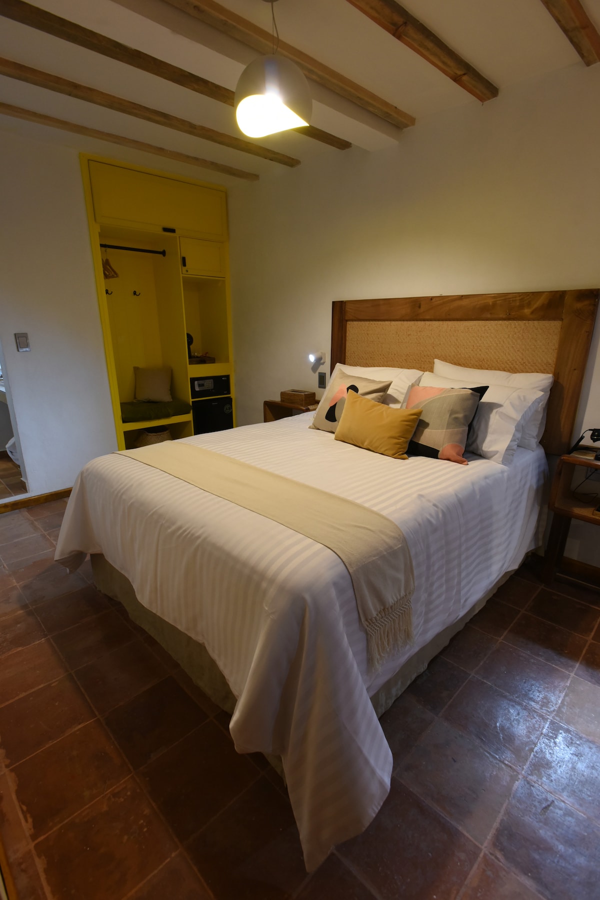 Hospédate en Casa Yága, un hotel boutique inspirado en la estética wabi-sabi, ubicado en el corazón de Querétaro. Esta acogedora habitación ofrece una cama king-size y un balcón privado con vista a la calle, ideal para disfrutar el ambiente colonial del centro histórico. Diseñada para el descanso, combina calidez, confort y estilo en un espacio sereno y auténtico. Perfecta para parejas o viajeros que buscan una experiencia única.