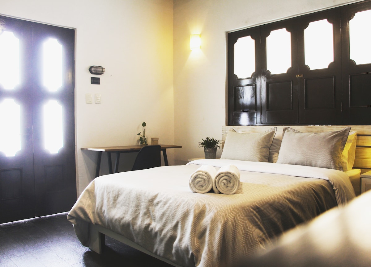 We invite you to experience comfort and privacy in our rustic-modern Studio! Integrated within an old mansion in the historic center of Querétaro, just a few blocks away from the cathedral and the historic Teatro de la República, our location is privileged in the heart of the city, in a peaceful area away from nighttime noise. Come and enjoy an unforgettable stay!
