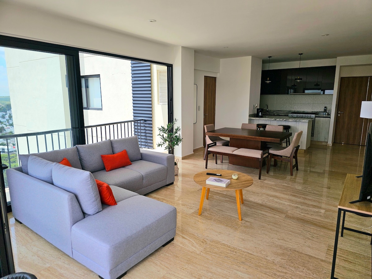Welcome to Life Juriquilla, a modern space in the heart of Valle de Juriquilla. Apartment A801 features 2 bedrooms plus a TV area, 2.5 bathrooms, a fully equipped kitchen, a spacious living-dining area, and a laundry area. This apartment is perfect for couples, small families, or business travelers. Enjoy fast Wi-Fi, a pool, gym, and green areas, all in a prime location with easy access to shopping centers, hospitals, industry, and main roads.