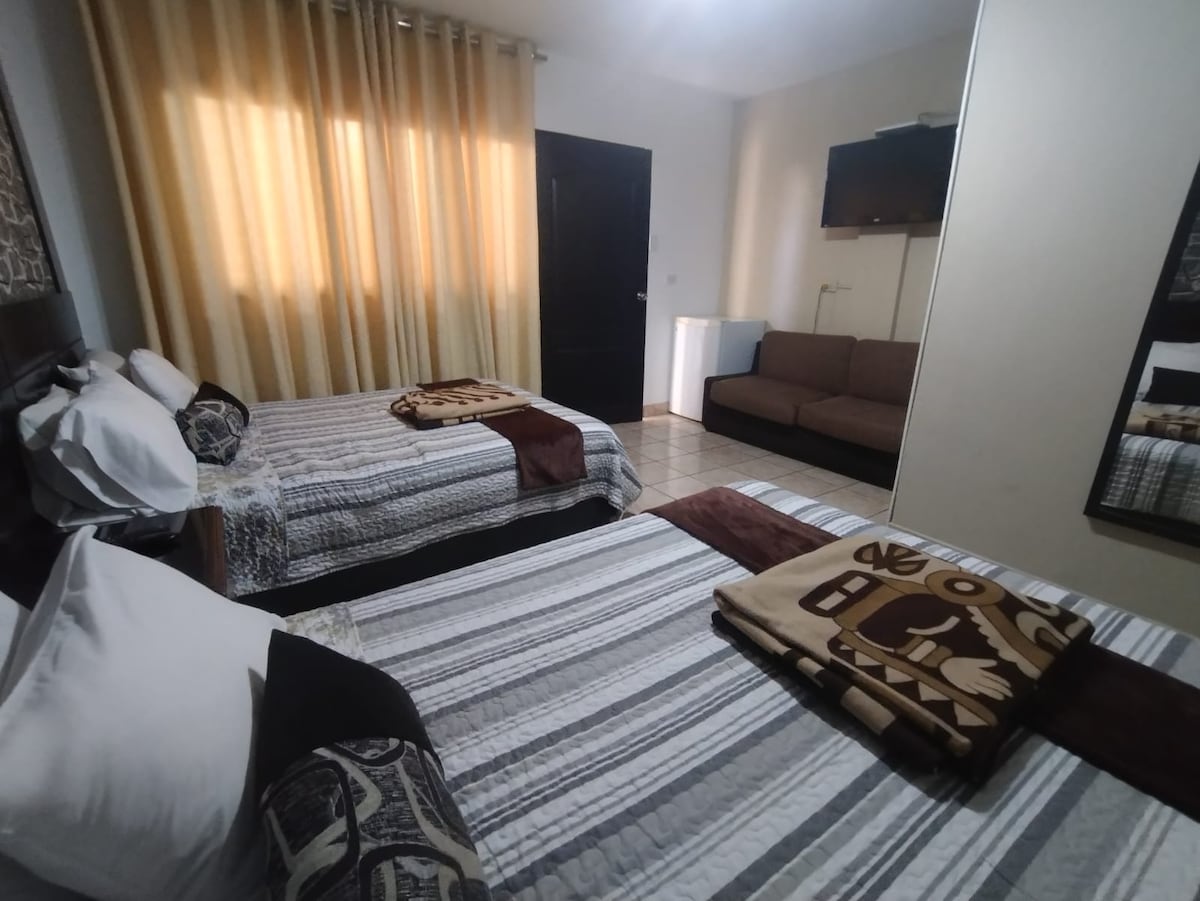 Habitación triple en el tercer piso de Monterrico Hotel Perú. Se encuentra ubicado en la Urb. San Ignacio de Monterrico un lugar privado, seguro y elegante. Aproximadamente a 15 minutos de Miraflores y a 50 minutos del Aeropuerto Jorge Chávez. Contamos con servicios adicionales como , desayunos, almuerzos, cenas , bebidas (aguas, cervezas, vinos, etc.). Habitación ideal para amistades o familia cuenta con 3 camas de dos plazas, aire acondicionado, Frio bar, armario, Wifi, etc.