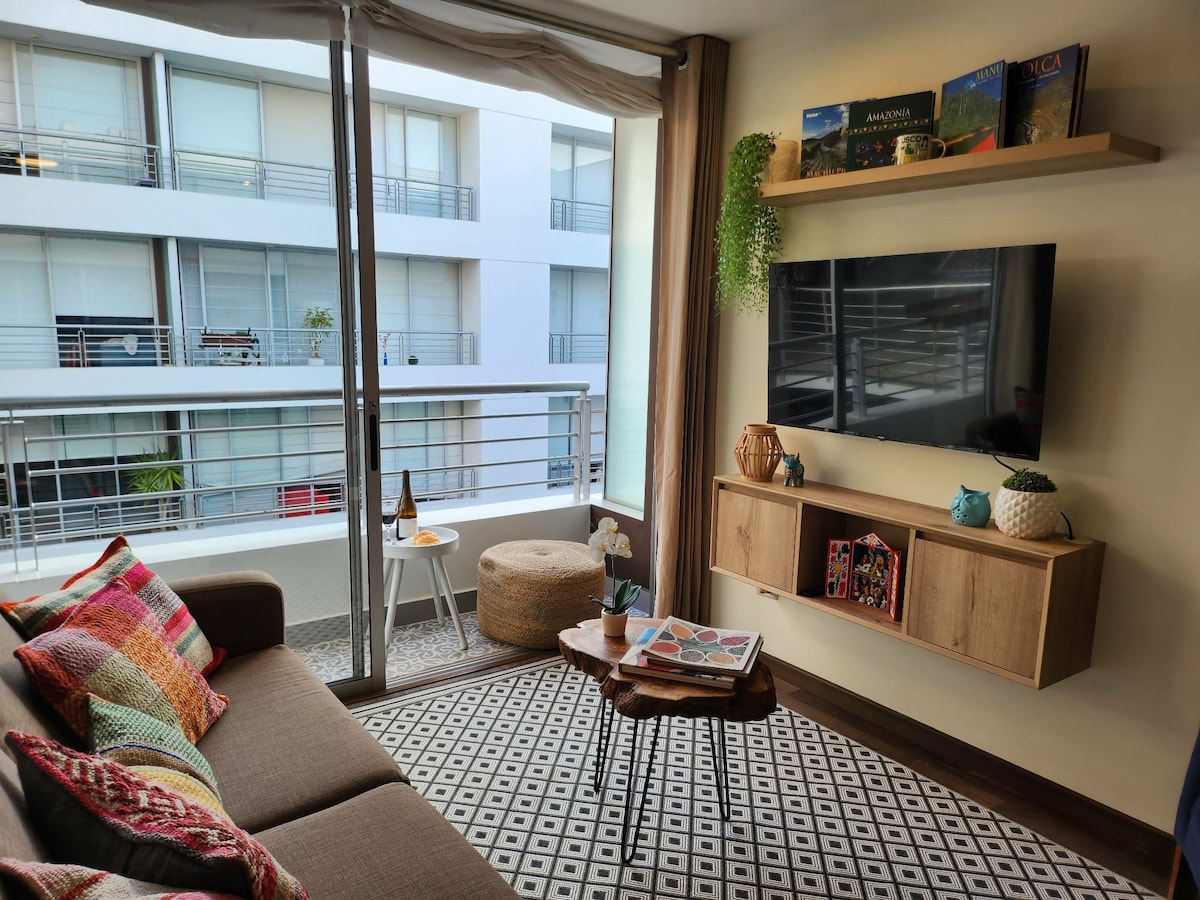 Lindo departamento ubicado a pocos pasos del malecón y centro turístico de Barranco. Desde el piso 13 tendrás una vista parcial del mar donde podrás pasar unas vacaciones relajantes, hacer turismo o escaparte con tu pareja. Cocina equipada, baño, sala de estar, cómoda cama queen y una acogedora terraza que harán de tus días placenteros.