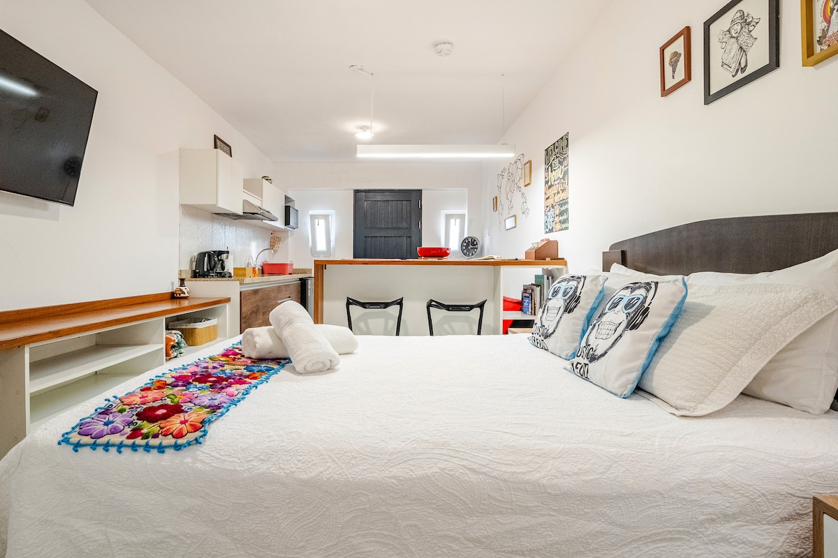 El Mini/departamento es confortable para 1 huésped, cama dos plazas/ matrimonial , amplio closet para estancias largas, un escritorio para trabajar y un televisor. Kitchenette con una cocina eléctrica de una hornilla, (COMIDA LIGHT) porque el ESPACIO ES PEQUEÑO Y CERRADO, una mesa abatible con 2 sillas, hervidor eléctrico, un frio- bar, licuadora personal, microondas, un mini grill y menaje. Un baño amplio con ducha eléctrica. El lugar seguro. Entrada independ. 2do. piso.