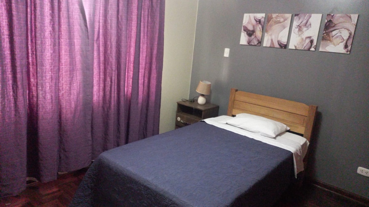 Habitación privada amoblada, de 2 ambientes integrados ( sala de estar - dormitorio ), con baño exterior privado , servicio wifi y Tv por cable. Dormitorio con cama vestida y accesorios ( mesa de noche, cómoda y espejo ). Con ventana hacia el exterior y una mesa escritorio cercana para laptop con silla. Expendio de toalla, jabón y papel higiénico. Barrio tranquilo, con acceso a varias rutas de transporte y áreas de comercio próximas. Acceso externo por escalera de caracol