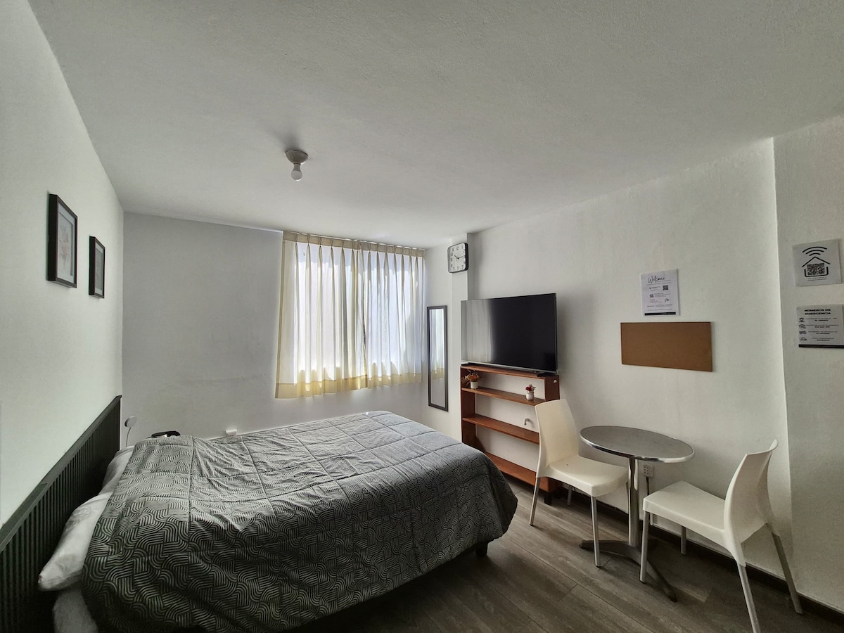 Enjoy, get away, rest and work in this quiet and elegant space. You will have 2 large Smart screens of 50" and 43" It is located in a central and safe area. It has a beautiful terrace and a view of the park. You have the Shopping Center just a step away, the boulevard, restaurants, gym, Starbucks and the United States embassy 5 minutes away. Wi-fi, televisions with Netflix, Star+, desk, kitchen and appliances, security and comfort