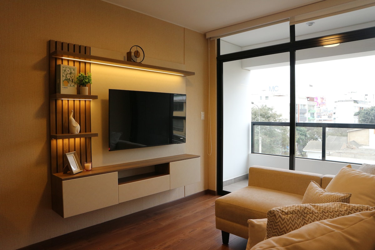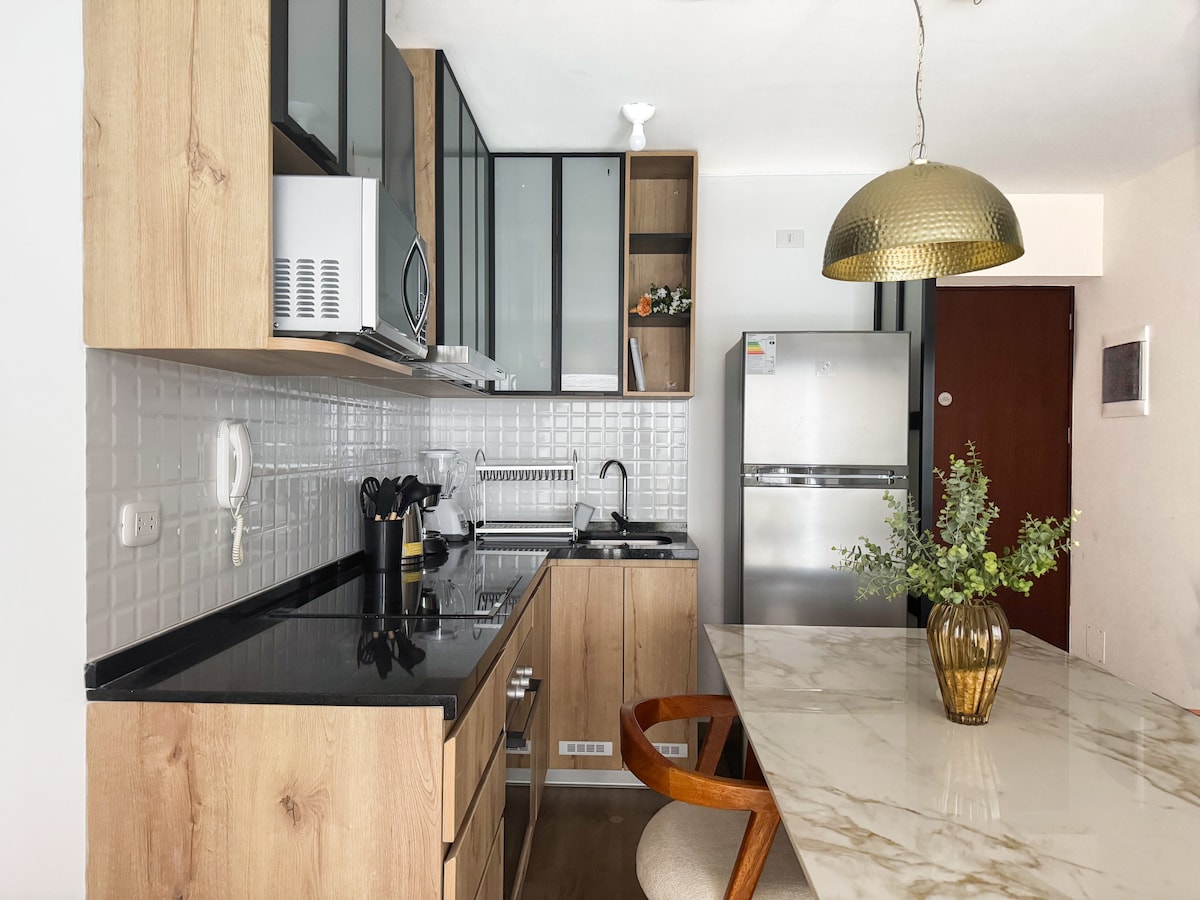 Enjoy, get away, rest and work in this quiet and elegant space. You will have 2 large Smart screens of 50" and 43" It is located in a central and safe area. It has a beautiful terrace and a view of the park. You have the Shopping Center just a step away, the boulevard, restaurants, gym, Starbucks and the United States embassy 5 minutes away. Wi-fi, televisions with Netflix, Star+, desk, kitchen and appliances, security and comfort