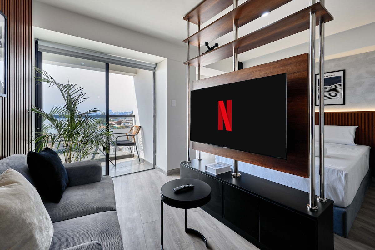 Modern and cozy brand new one-room apartment, fully furnished and with 5G high-speed internet. Its large windows provide natural lighting and also has a small balcony. The building has 24-hour security and common areas such as a terrace with BBQ grills, a gym, a laundry room, and a coworking space, all available to guests. It is located on Higuereta Avenue: a central, safe, and connected area with public transportation stops. 7 blocks from the well-known Chacarilla Shopping Center.