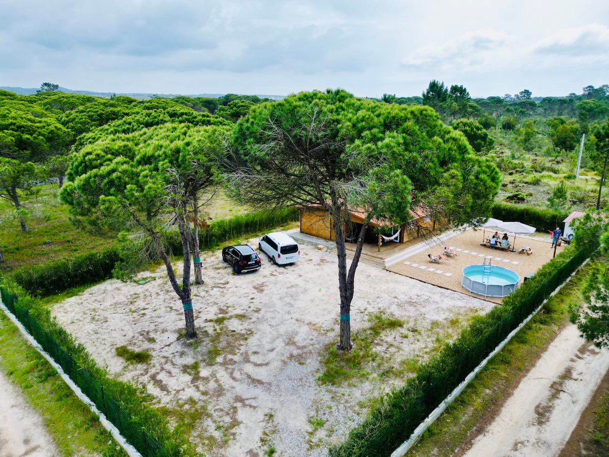 With our cozy wooden cabin, you will feel like in a tree house. Shaded by cork oaks, you can enjoy the serene atmosphere from the deck or in our outdoor lounge where we will serve you a delicious breakfast (local, high quality/organic products). Everything here has been made by us, with love and 99.9% natural materials so you can enjoy peace and quiet. We are in a quiet, yet very convenient location, 20 min from the beautiful beaches of Vilanova de Milfontes.