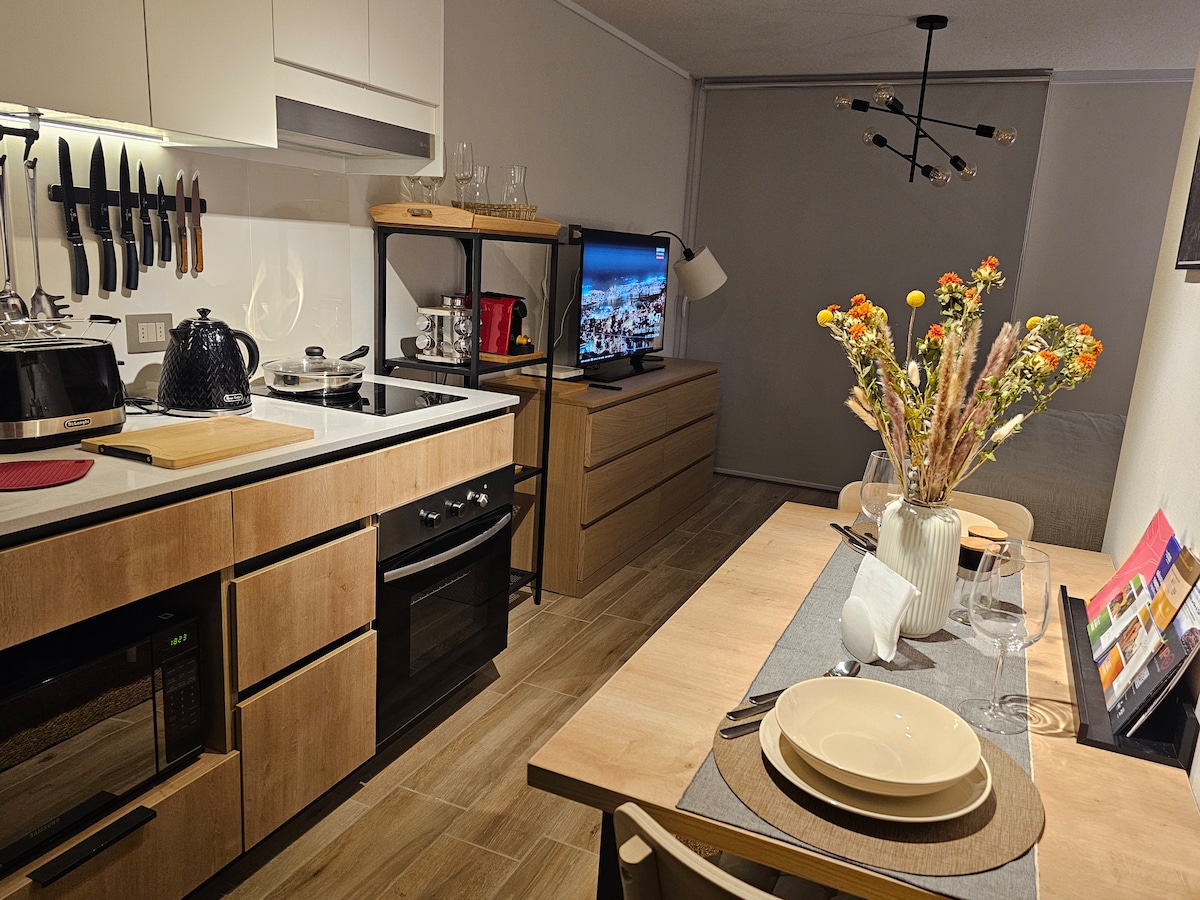 Enjoy a great experience in this save location in Barrio El Golf. Modern and cozy apartment with a privileged location, in the heart of gourmet cuisine and luxury shops of Santiago de Chile "Barrio El Golf". The neighborhood is characterized by its great architectural value and its attractive and varied cultural, gastronomic, and recreational offer. (restaurants, cafes, bars, theaters, museums, design galleries, etc). A few meters away is the metro station ¨Escuela Militar¨ and Plaza Peru.