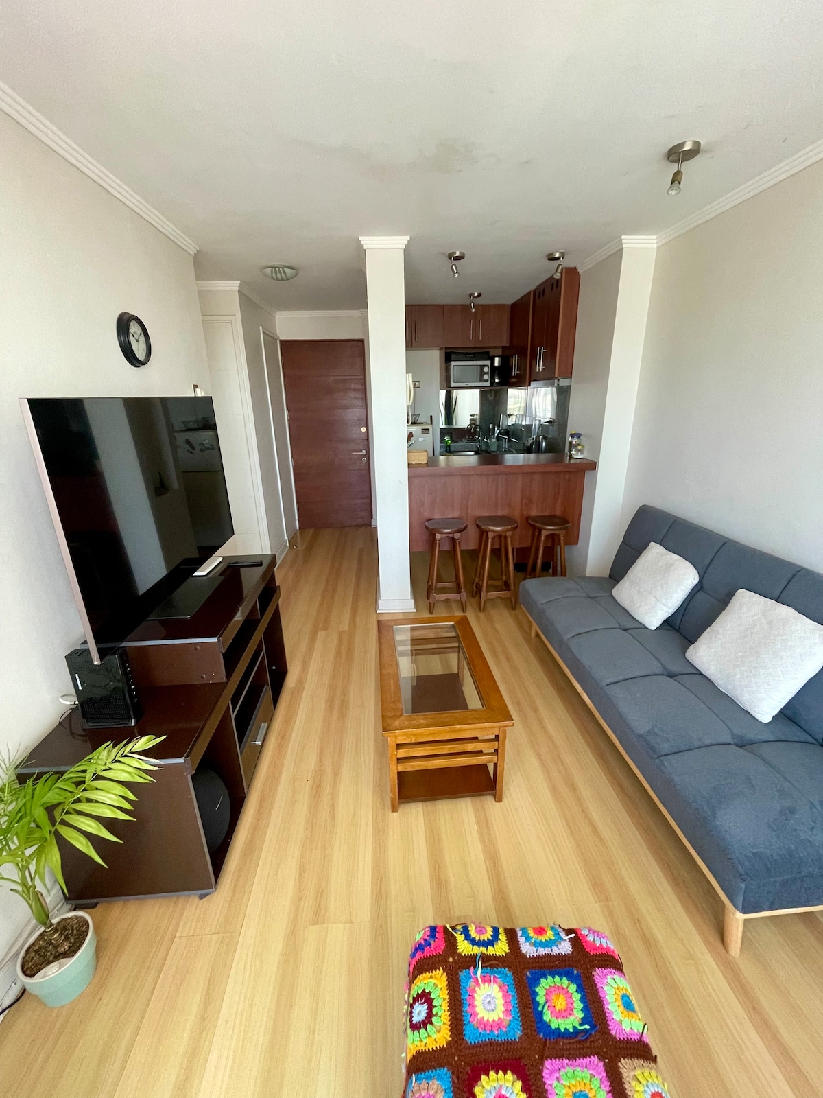 Small apartment, newly renovated, with view over Higuerillas and Playa Negra and Playa Amarilla. One Bedroom, one bathroom, small kitchenette and living room (living room equipped with Bed sofa). Bed sofa is comfortable but i would say it is for One adult or a very in love couple or two children. Large Terrace, parking space and access to buildings pool (same floor level) and barbecue spot. Proximity to small restaurants of Concon. The Apartment has its own parking.