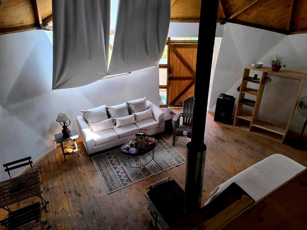 Experiencia diferente en un domo recién renovado de madera , tiene aire para climatizar, realmente precioso , vista a las montañas , absoluta tranquilidad , total privacidad en un Lugar de relajo y desconexión. Un lugar mágico para ir en pareja , cerca de viñas , paseos en el cajón del maipo, a los pies de las montañas , excelentes lugares para almorzar o comer como el "ESKENAZO" A 7 minutos del domo .