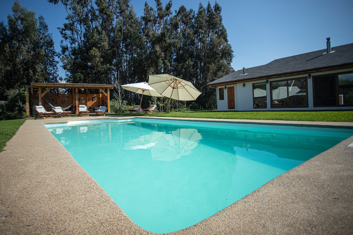 Attention: Our pool is open for swimming but is still undergoing some maintenance around the terrace. Set on a luscious green piece of land we like to call Villachampa, our cozy modern rustic cabin invites you to escape the noise and pollution of Santiago in a peaceful rural setting just 45 minutes south of the city right off Ruta 5. You can also take the train from Estacion Central, in Alameda (Santiago) to Hospital station and we will pick you up from the station for free, no need to walk!