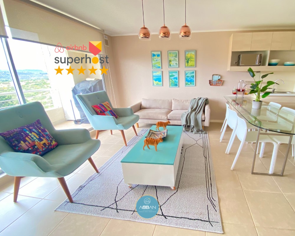 Departamento con vista panorámica. 3 habitaciones, 2 baños, 2 estacionamientos y cocina equipada. Incluye: • Wifi • 2 kayaks • 2 bodyboards • Parrilla Máximo 6 personas. El recinto tiene canchas, juegos, restaurantes y una de las piscinas más grandes del mundo para navegar y practicar deportes acuáticos. Piscinas para baño disponibles: • Fines de semana (31/10-08/12). • Todos los días (14/12-15/03). • Festivos todo el año. Piscinas temperadas y jacuzzi exclusivos para propietarios.