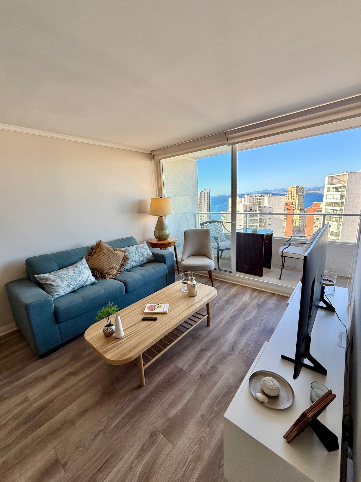 Espectacular departamento en Concón con vista al mar y piscina temperada. El departamento cuenta con áreas verdes y juegos infantiles, piscina al aire libre, amplia terraza privada con vista al Océano Pacífico. Hay servicio de sauna (de pago). Se encuentra a pocos pasos de las Dunas de Concón, supermercados, restaurantes, bares y del parque Costa de Montemar. A minutos caminando a playa Los Lilenes. Se cuenta con Wifi y Smart TV en el dormitorio, estacionamiento privado.