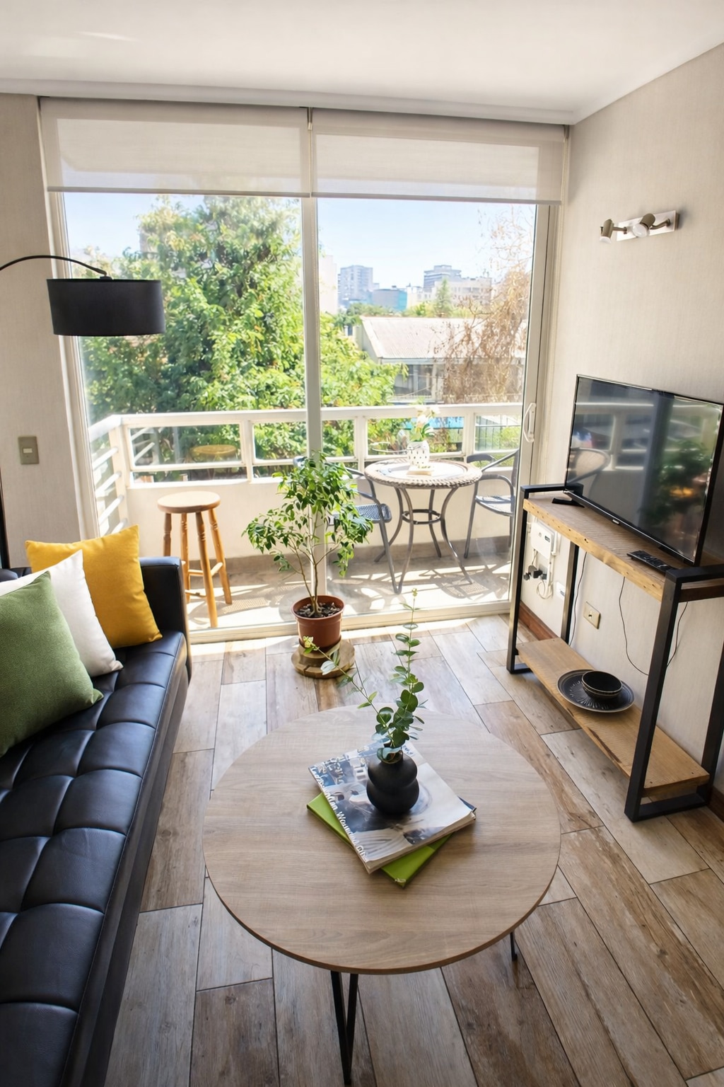 Desayuno al sol, balcón largo y vista verde