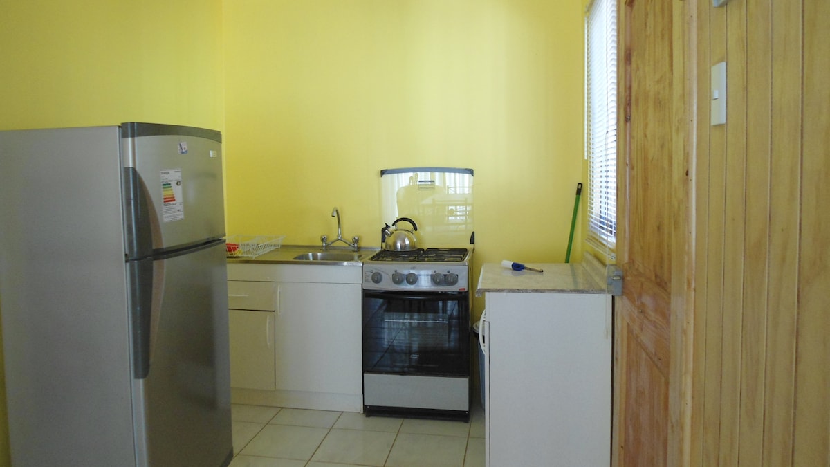 Pequeña y acogedora casita muy iluminada con lo necesario para una cómoda estadía para 4 huéspedes (consultar variación de precios por cantidad de personas y camas extra). A 5 minutos en auto del centro de la ciudad, a una cuadra del camino a la costa, supermercado y comercios a tres cuadras.
