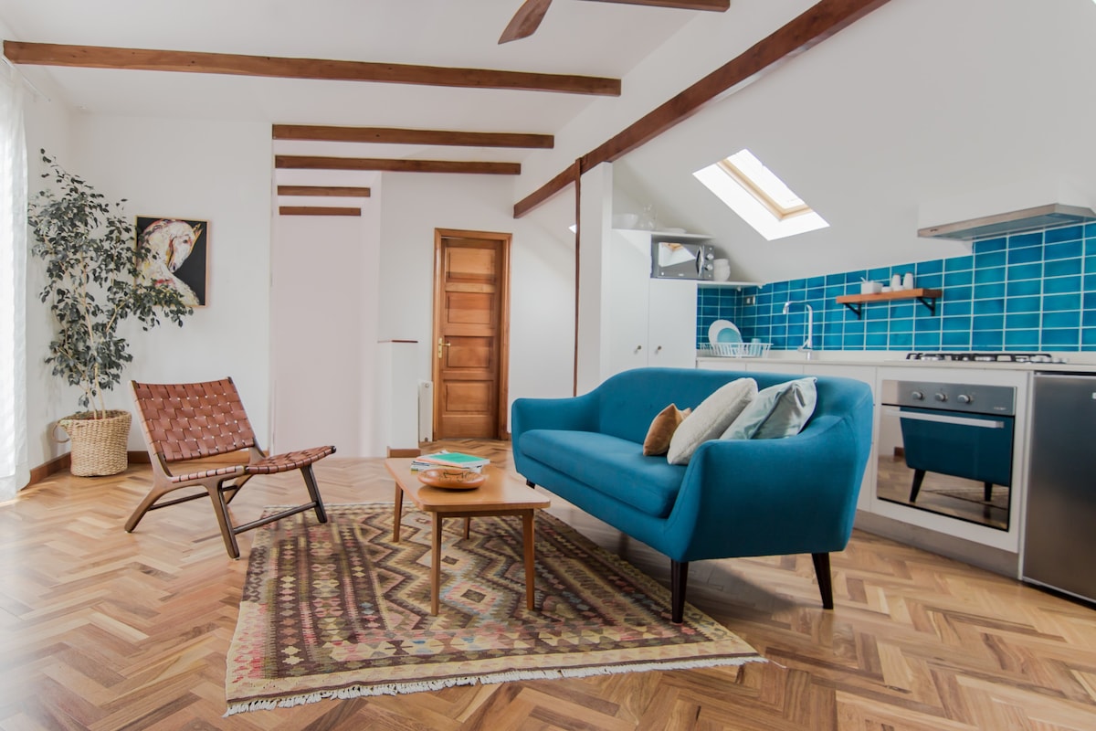 Beautiful and bright loft in the attic of remodeled house, uniquely designed and decorated with local art, located in a quiet residential street in the trendy neighborhood "Barrio Italia", 5 blocks from the subway and steps from the Bus and bicycle lanes.