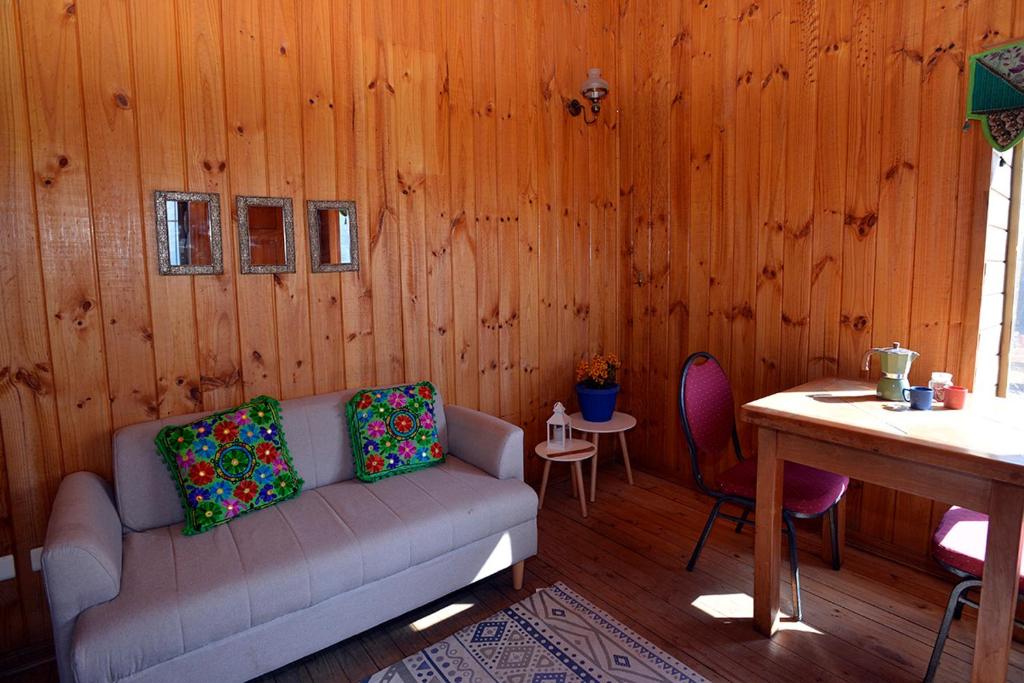 Hermosa cabaña edificada entre un pequeño bosque que da tranquilidad y frescura para deleitarse de una barbacoa en su terraza o un relajante baño en tinaja con agua caliente. Y para esos días calurosos podrá refrescarse en la piscina. Además dentro del recinto podrá disfrutar de sus miradores con fascinantes vistas al valle y registrar atardeceres y montañas nevadas. *Tinaja y piscina de uso exclusivo de los huéspedes. *Estacionamiento gratuito. *Tinaja no incluida en el valor.