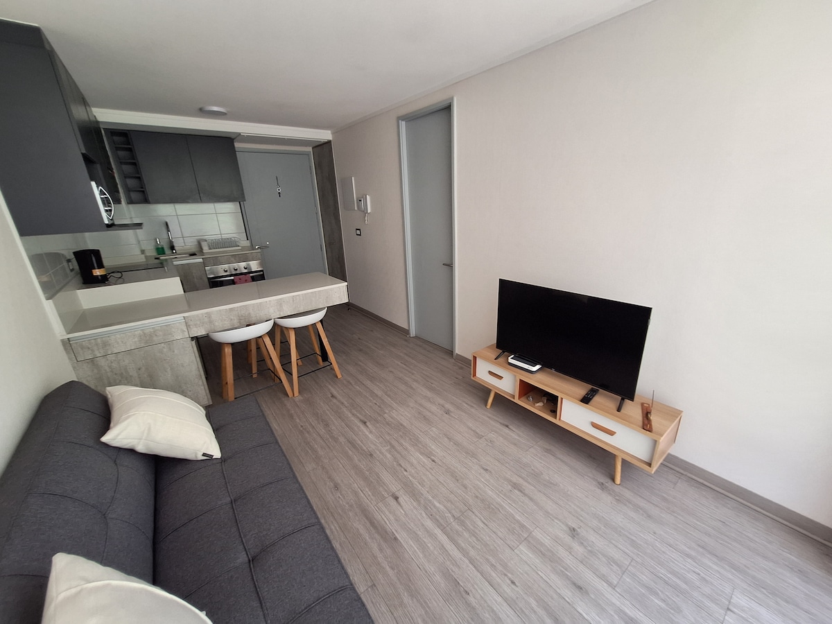 Departamento con estacionamiento incluido (APTO PARA PERSONAS CON DISPACIDAD REDUCIDA) Equipado, aire acondicionado, horno, encimera, utensilios de cocina Balcón con zona para fumadores, WiFi, TV en la habitación, disponible para 2 a 3 personas (cama matrimonial y futón). Llegada autónoma (conserjería24/7) Check in: desde las 15.00hrs Check out: hasta las 11.00am Se permite dejar equipaje. Manuel Antonio Tocornal 678, Santiago Se pedirá identificación de los pasajeros No se permiten visitas