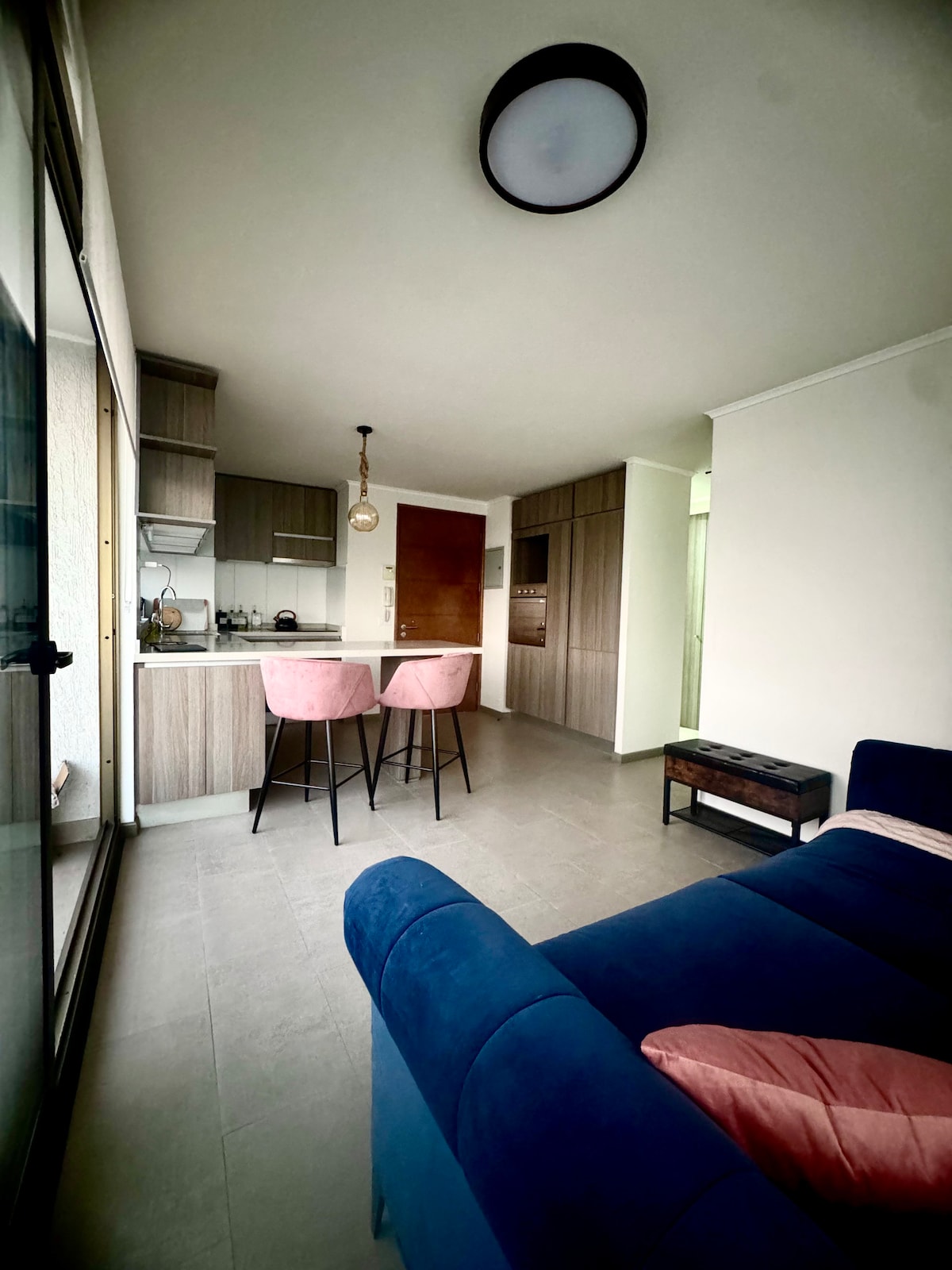 Relájate en este espacio tan tranquilo y elegante. No es solo un alojamiento, es una experiencia completa, donde proseas disfrutar la tranquilidad y comodidad en un espacio moderno. Despierta con un café fresco, pasa el día explorando la ciudad o practicando kayak en la laguna, y regresa a un espacio acogedor diseñado para tu descanso. Sala de estar: Confortable sofá azul terciopelo y banca baúl para los zapatos. Cocina americana Buena conectividad, Metro Carlos Valdovinos (L5), Híper Líder