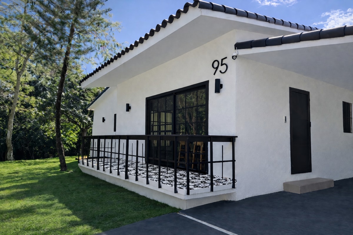 Get back in touch with nature surrounded by the lush tropical forest of Jarabacoa. This modern mountain home features soaring ceilings, natural materials throughout, contrasting textures, and access to a shared outdoor pool. The property is located a few minutes from the town of Jarabacoa and tourist attractions such as rafting, cycling trails, cliff diving, paragliding, ziplining, and other excursions. The vacation complex is conveniently located across from the most popular steakhouse in the area, and has a community pool, playground, and tennis and basketball courts. Rental of the home is for the exclusive use of guests. In case of emergency or any unforeseen issues guests will be assisted by the property manager. If requested and available, housekeeping services can be provided including meal preparation (breakfast, lunch, dinner) for an additional fee. The property is located on a holiday complex located in the area of Buena Vista, Jarabacoa. Para contacto por whattsap +1 202-476-9402. La locación del complejo vacacional es estratégica y con buen acceso, incluso hay lineas de transporte público que cruzan justo al frente de la entrada del complejo. La casa cuenta con una marquesina con capacidad para cuatro (4) vehículos. También hay un área de parqueo para visitantes con capacidad para diez (10) vehículos, a unos de 50 metros de la casa. The home has a generator in case of electrical outages.